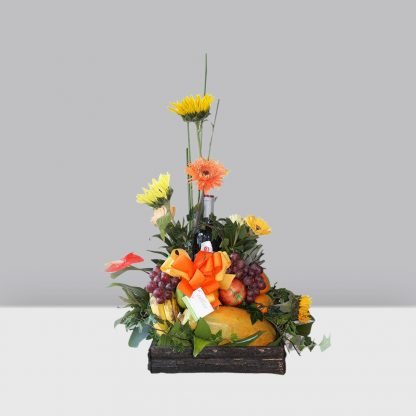 Deliciosas frutas con una botella de vino, adornadas con girasoles, gerberas naranjas y anturias, con una altura de 0.60 cms.1 Base de Madera0 Diversidad Fruta1 Botella de Vino4 Girasoles3 Gerberas Naranjas1 Anturias