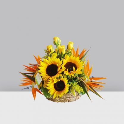 Combinación de girasoles, rosas amarillas y aves del paraíso, con una altura de 0.35 cms.3 Girasoles4 Rosas Amarillas4 Aves del Paraíso1 Canasta
