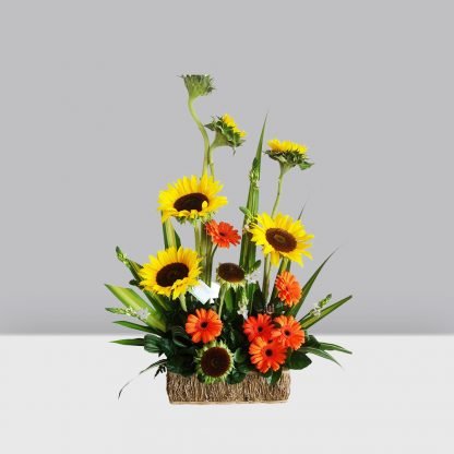 Hermoso arreglo de girasoles y gerberas naranjas, con una altura de 0.70 cms.8 Girasoles6 Gerberas Naranjas1 Canasta