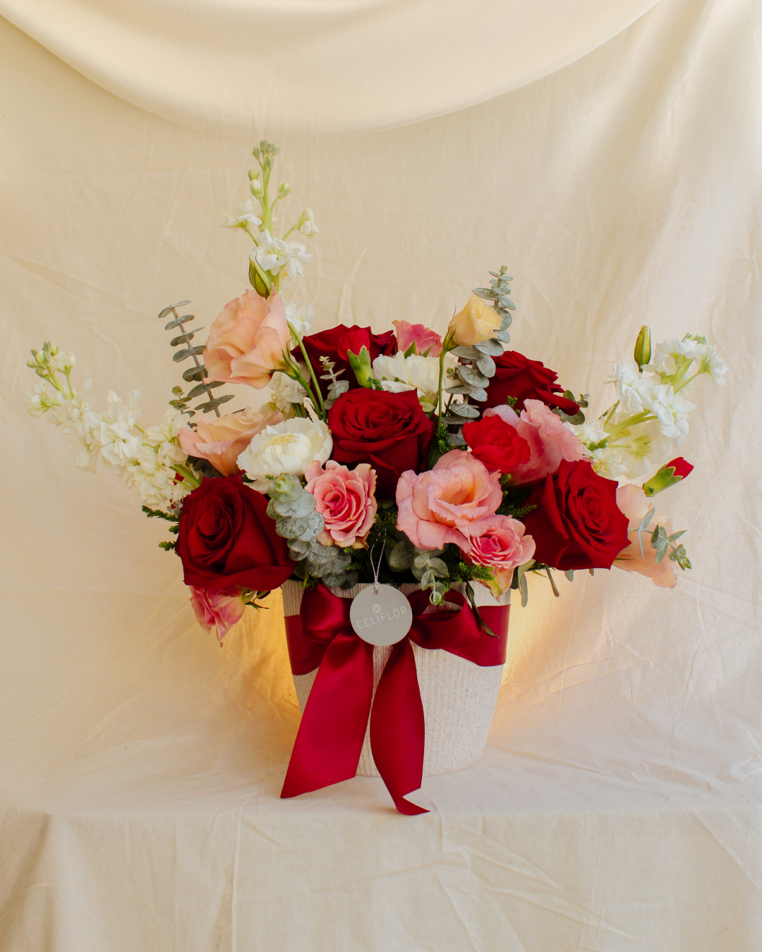 Arreglo mediano de rosas Rojas, stock blanco, claveles blancos, lisianthus, mini rosa rosada, stock blanco, mini clavel rojo, eucalipto y toques de follajes variados sueltos.