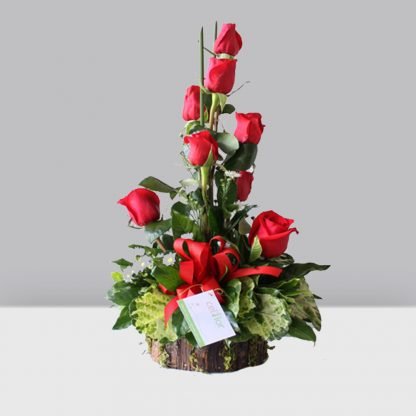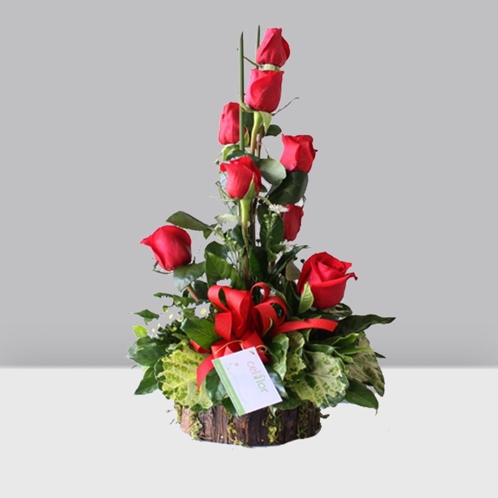 Pequeño arreglo de rosas rojas en base de corteza. 1 Base de Corteza 10 Rosas Rojas