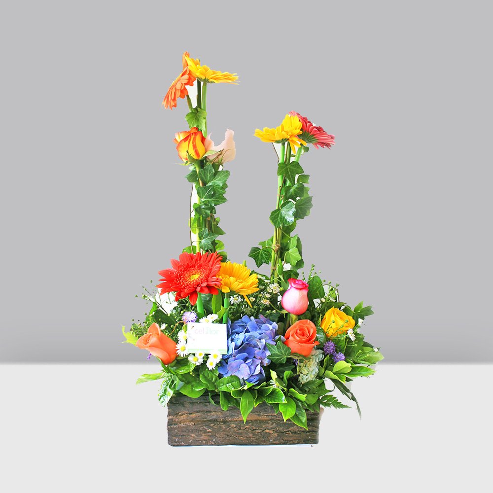 Divertido arreglo de gerberas y rosas de colores.0 Rosas de Colores0 Gerberas de Colores