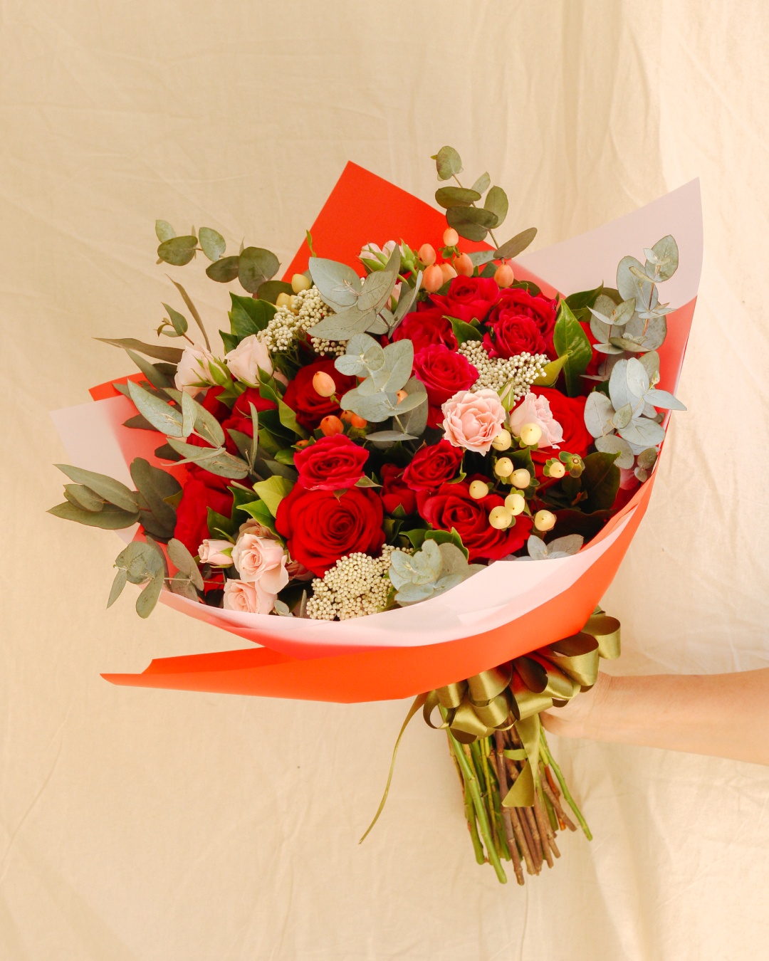 10 rosas en tonos rojo y fucsia, mini rosa rosada y fucsia, hipericum salmon, hipericum crema, rice flower y toques de eucalipto.