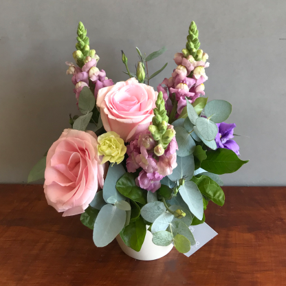 Arreglo de rosas, lisianthus morado y dragones rosados en base cerámica*.