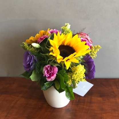 Arreglo de girasol, gerbera, rosa, lisanthius morado, mini clavel y flores de complemento en base cerámica*.