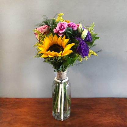 Ramo de girasol, rosa, lisianthus morado, mini clavel y flores de complemento*
