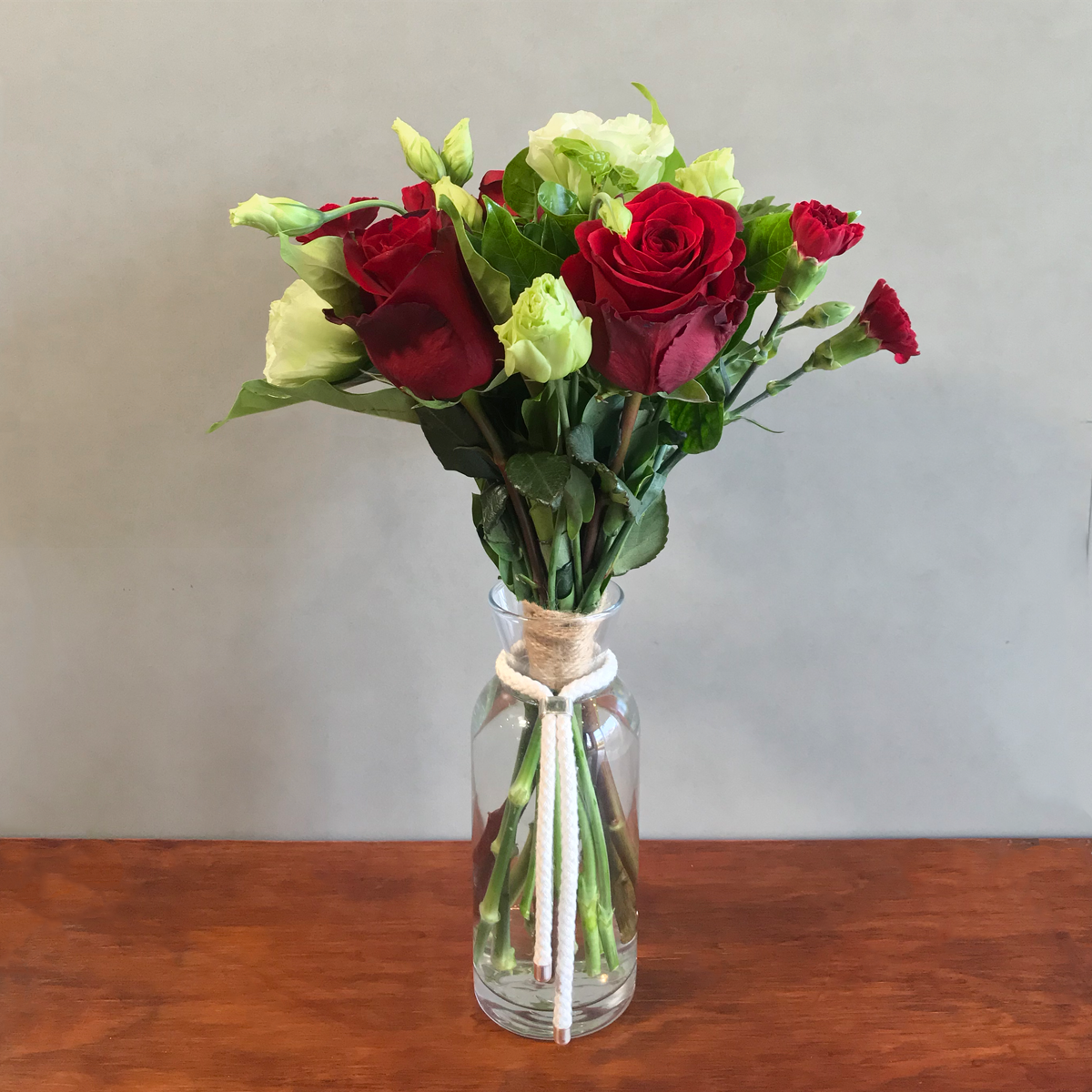 Ramo de rosas Rojas, lisianthus verde y mini clavel rojo*