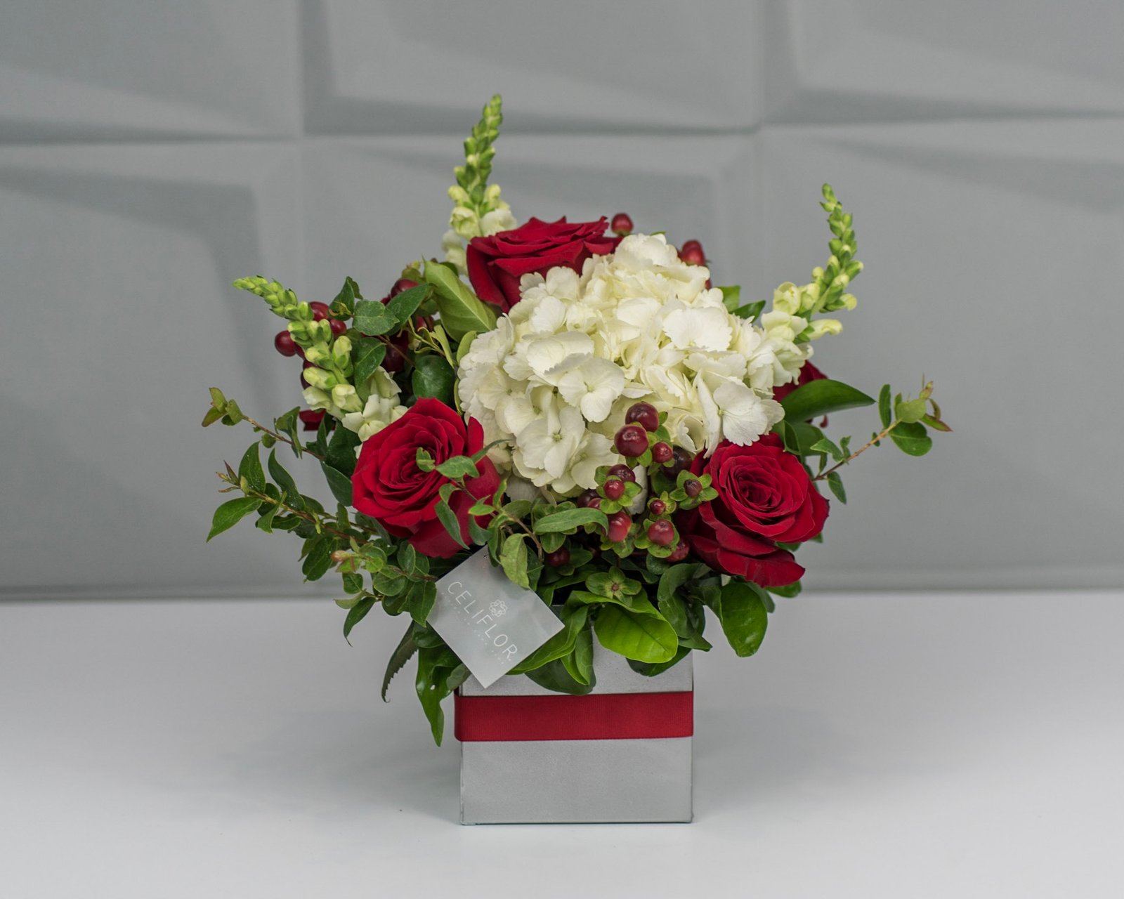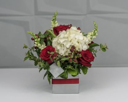 Caja metálica con rosas rojas y flores blancas