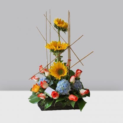 Combinación de girasoles, rosas y hortensia en base de corteza.