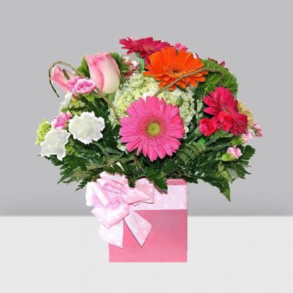 Base metálica en forma de cubo decorado con gerberas, rosas y claveles de distintos colores.
