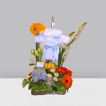 Divertido arreglo con anturias, rosas, gerberas y hortensia, acompañado de un mini poncho personalizado con la inicial del nombre del bebe.