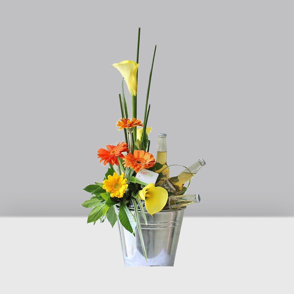 Balde metálico con cartuchos amarillos y gerberas naranjas, acompañado de 3 cervezas extranjeras.1 Balde Metalico3 Cartuchos Amarillos3 Cervezas Extrajeras3 Gerberas Naranjas