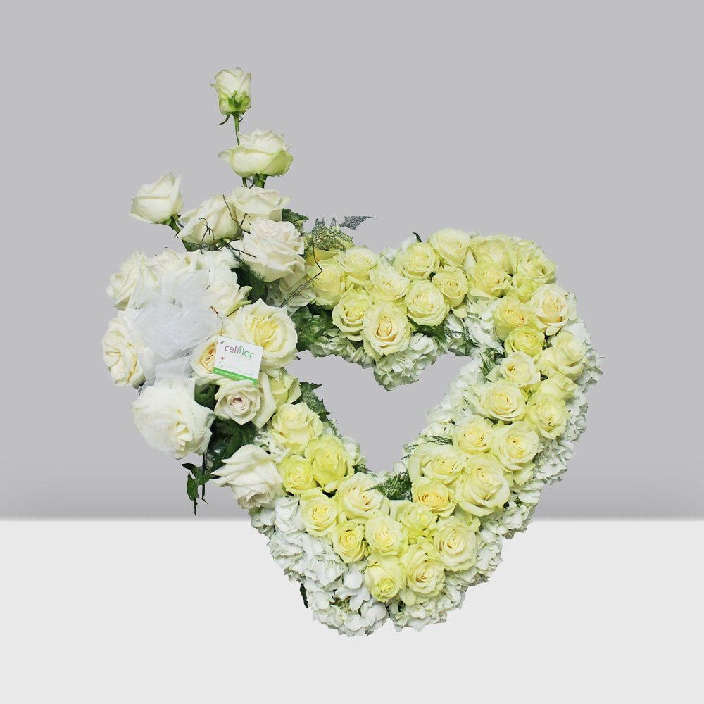 Corazón en tonos blancos de rosa y hortensia.
