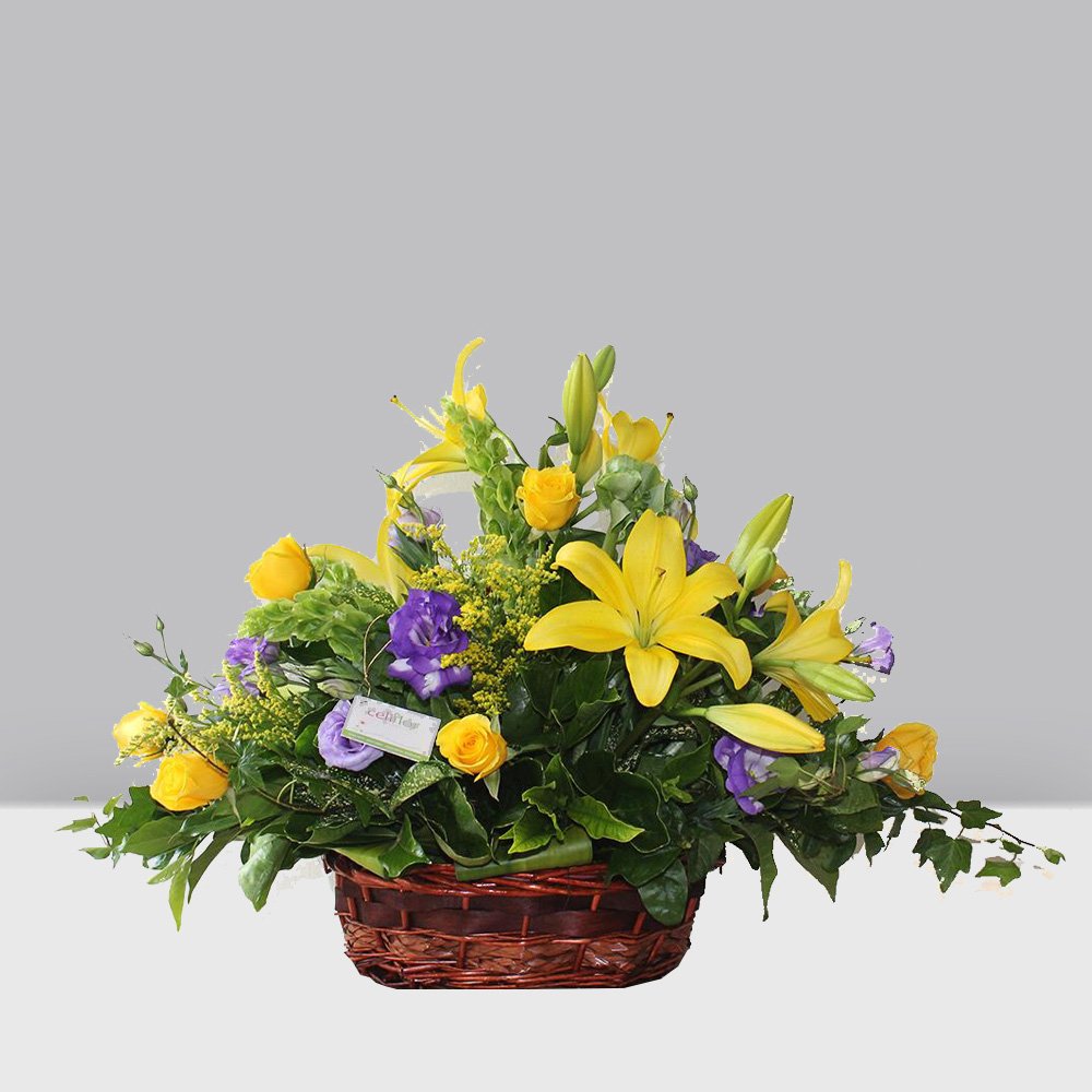 Lirios y rosa amarillas combinado con lisantrium morado en canasta.0 Lirios Amarillos0 Rosas Amarillas0 Lisantirum Morado1 Canasta