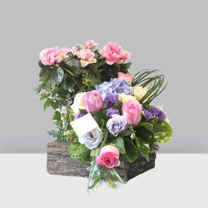 Planta azalea acompañada con un hermoso arreglo en base de corteza.