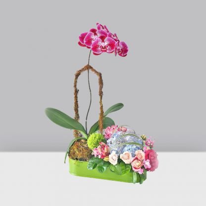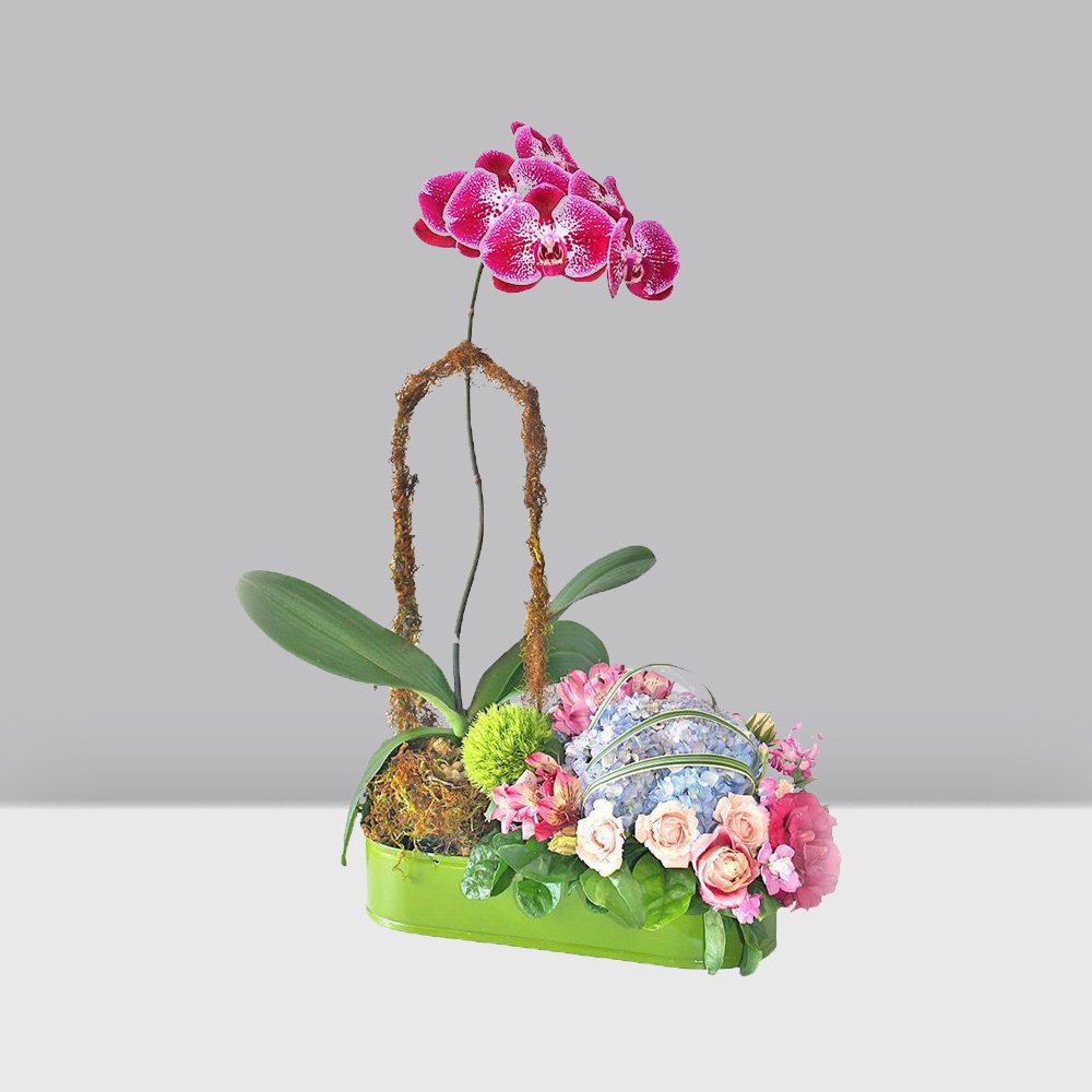 Jardín de rosas, hortensia y lisantrium acompañado de una planta de orquídea.