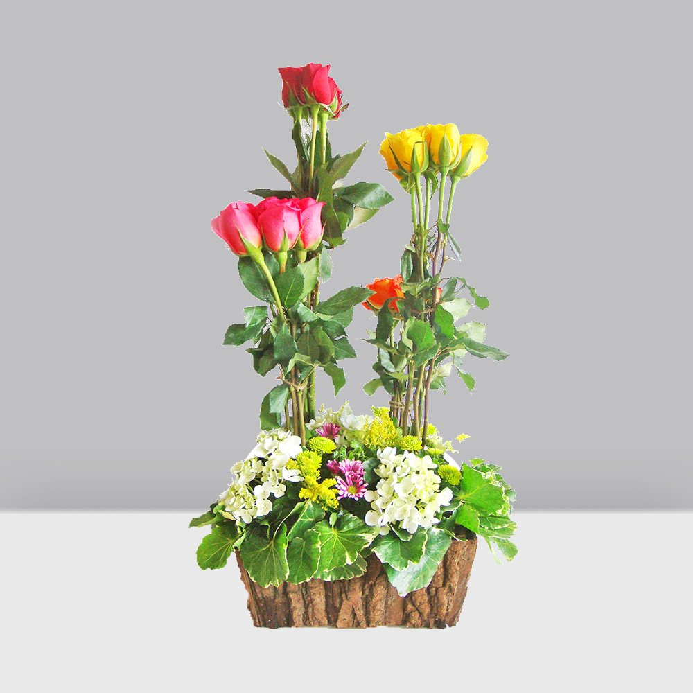 Rosas rojas, amarillas, naranjas y fucsia acompañadas de hortensia y follaje fresco.