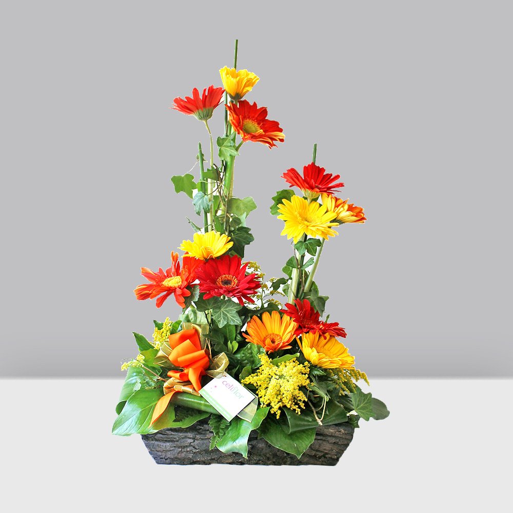 Cálido arreglo de gerberas naranja, rojas y amarillas.