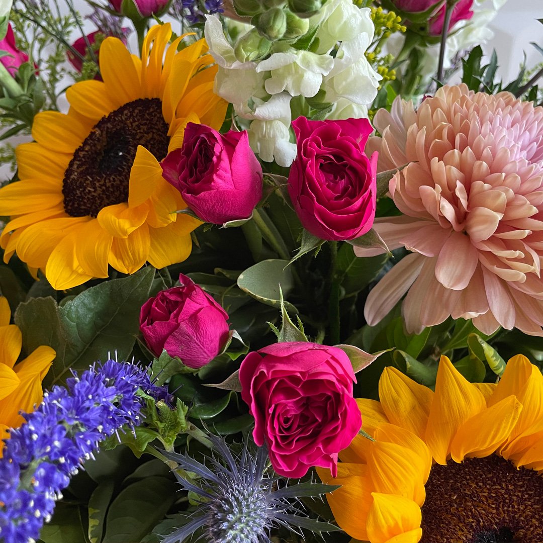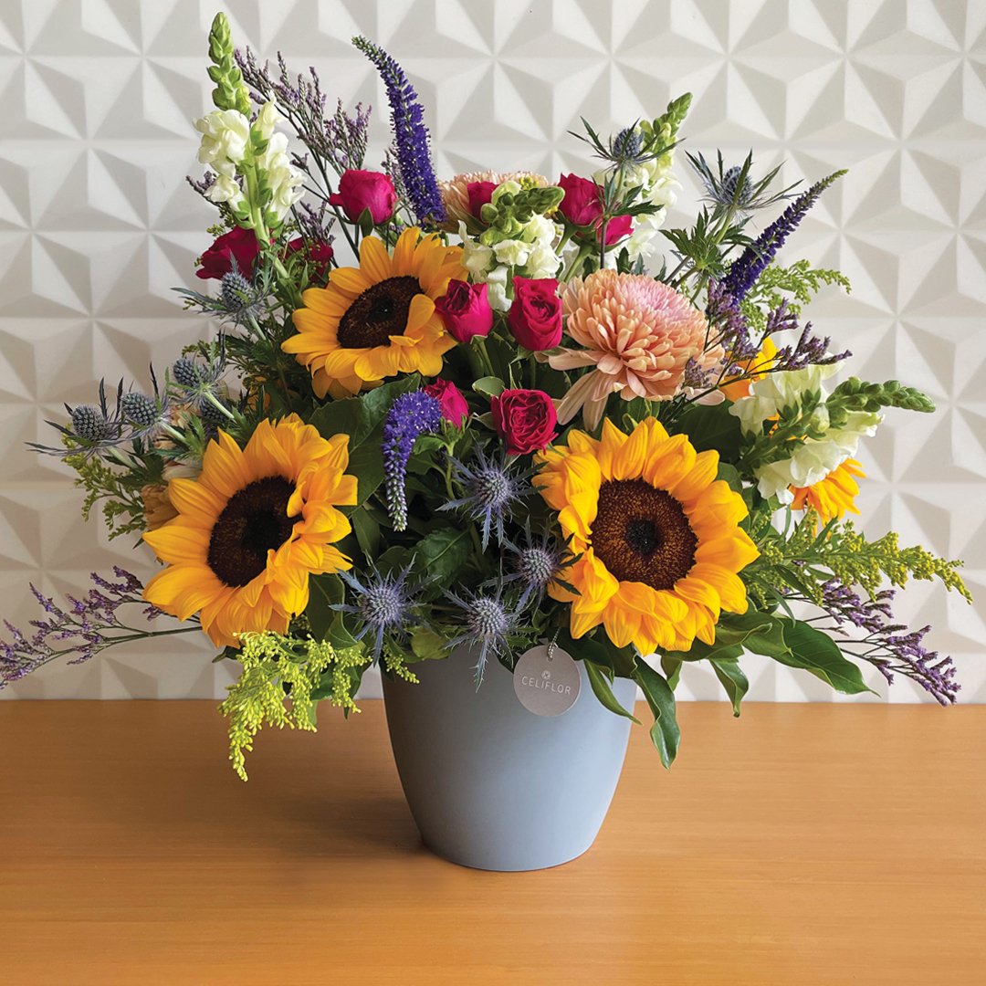 Girasoles grandes, mini rosa fucsia, verónica, eryngium, dragon, solidago, y crisantemos.