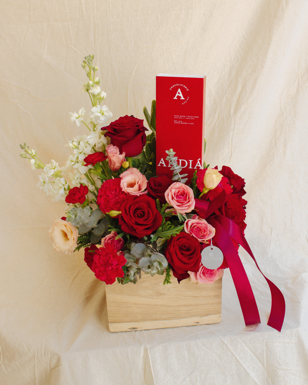 Rosas rojas, mini rosa rosada, lisianthus, stock, clavel rojo, eucalipto y toques de follajes variados sueltos. Incluye caja de 12 bombones especiales de Andian Chocolaterie (sabores surtidos).
